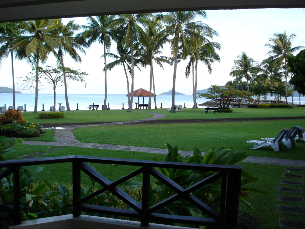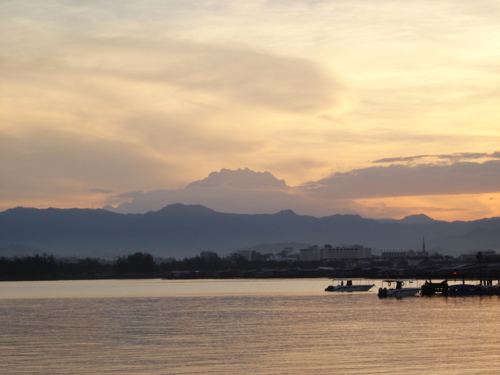 Sabah has a large variety of landscapes. Pictured here is Mount Kinabalu. At a little over 4100 meters, it is the tallest mountain between the Himalayas and New Guinea. This picture was taken at sunrise from the resort boardwalk. The capital of Sabah, Kota Kinabalu, is in the foreground.
